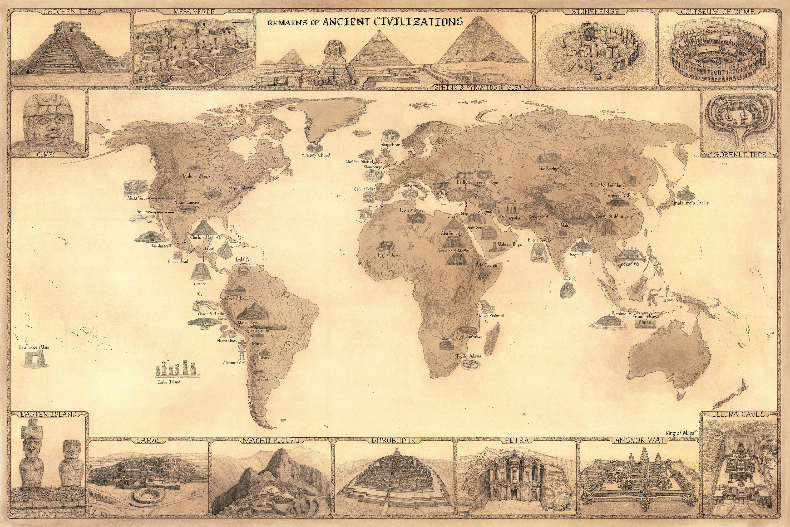 ANCIENT CIVILIZATIONS HAN DRAWN MAP Over 60 ancient sites